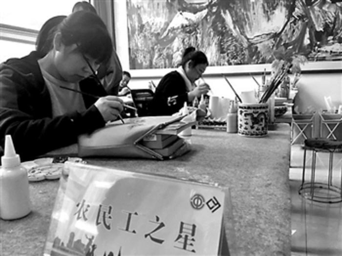 图为11月17日,经过“农民工学堂”培训的农民工在工友创业园制作手绘产品。本报记者 徐新星 摄
