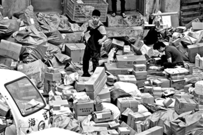 几十台快递车进进出出,堆积如山的快递占据了半个停车场。