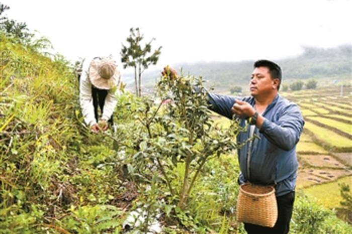 曾在马帮路上背货的旦增江措在茶园采茶(4月8日摄)。新华社记者 李鑫 摄