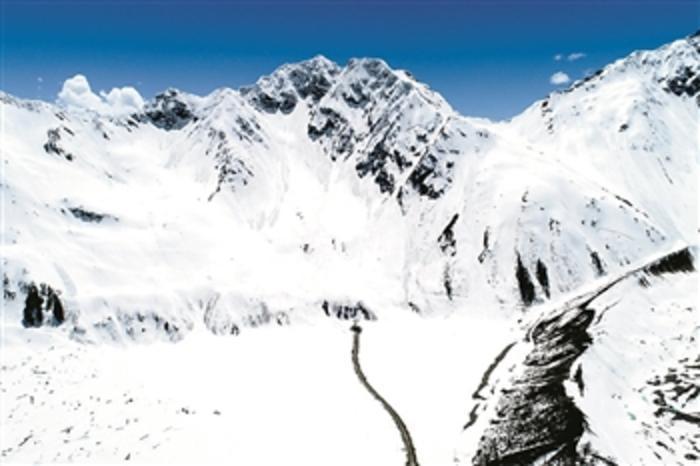 俯瞰嘎隆拉隧道(中)波密县一侧的墨脱公路(4月11日无人机拍摄)。