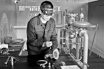 图为南通市燃气总公司调压工陈德强正在比赛,他最后荣获了个人三等奖。 朱余水 摄