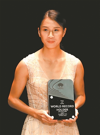 下图:11月23日,中国竞走运动员刘虹凭借年初打破50公里竞走世界纪录的成绩,在颁奖典礼上登台领取世界田联为本年度创造世界纪录的运动员颁发的纪念奖牌。
