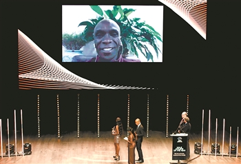 上图:11月23日,年度最佳男运动员获得者、肯尼亚长跑名将基普乔格通过视频发表获奖感言。