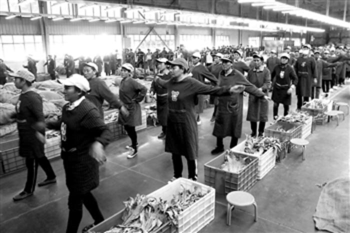 11月22日,四川省凉山彝族自治州德昌县烟叶复烤厂选叶车间内,数百名员工利用上班间隙开展工间操活动。工间操是该车间“幸福课堂”中的一项,复烤厂还利用岗前培训、班前会议、午间休息的机会,引导员工学礼懂法、举止文明,提升员工的综合素质。张浪 摄/视觉中国
