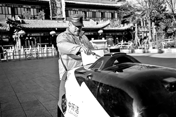上图为11月20日,在呼和浩特市大召广场,玉泉区环卫局职工在查看智能清扫机的垃圾储备箱。