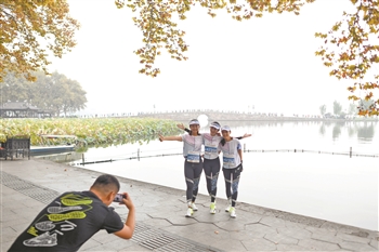11月3日,杭州马拉松赛,参赛选手在比赛中停下来在杭州西湖留影。
