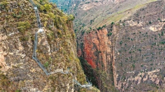 通往阿土列尔村峭壁上的钢梯一角(11月23日无人机拍摄)。