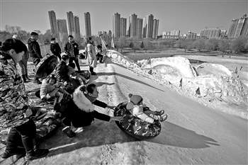 吉林省吉林市,市民在松花江畔一家冰雪乐园体验雪圈滑行。视觉中国 供图