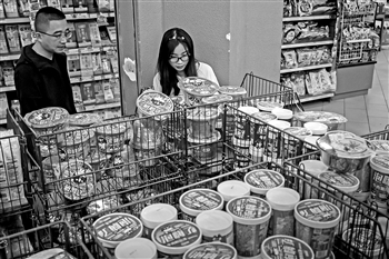 冬季气温骤降,“火锅旺季”悄然来临,自热火锅这一网红食品再一次成为消费者追捧的对象。然而,这一方便快捷、自带加热包的食品却暗藏爆炸隐患。近日,重庆一辆满载着2吨自热方便火锅的货车在运输途中突然起火,关于自热食品的安全性问题再次引发关注。图为北京某大型超市,消费者正在促销货架上选购自热火锅。本报记者 王伟伟 摄