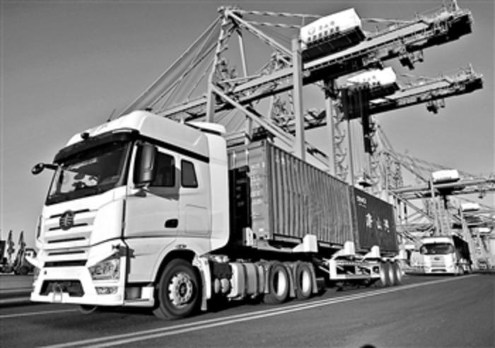 11月25日,无人驾驶集装箱卡车在唐山港京唐港区集装箱码头运送集装箱。