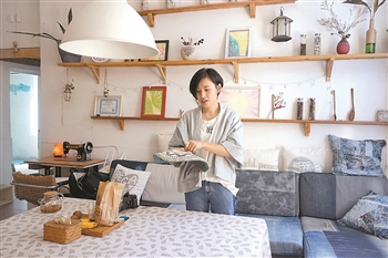 在赵静的指点下,记者找到了屋子里不少的“秘密”:旧的牛仔裤经过裁剪、缝制,成为让破沙发焕然一新的沙发套;捡来的木板稍加处理做成了层层叠叠的厨房置物架;木衣架是用粗大的树枝充当的,废弃的门把手则成了很好用的挂钩……