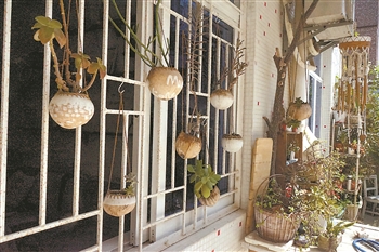 赵静家窗户上挂着的花盆是用椰子壳做成的。