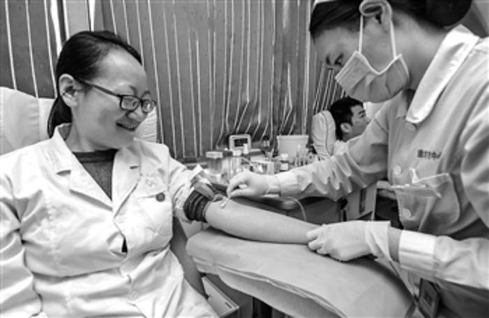 12月4日,河北省廊坊市大城县留各庄镇中心卫生院刘变华在活动中献血。