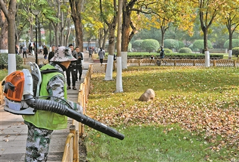 12月2日,武汉中山公园,金黄的枯叶散落于公园草坪,园方工作人员身背一个形似大号“吹风机”的落叶清扫机进行作业,树叶随即被清理归堆,再由其他人员挥舞扫帚,集中打包处理,连低矮灌木底部的缝隙处也一并清理干净。 承影/视觉中国