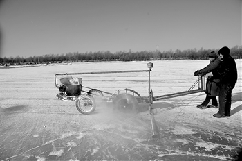 12月3日,哈尔滨市公路大桥北侧附近的松花江冰面上,工人们正在用锯对冰层进行分割。