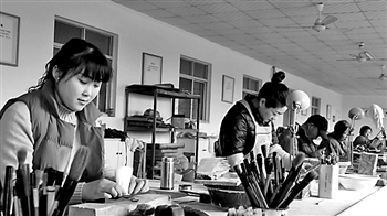 图为阴平镇贫困农民在阴平镇书源笔业有限公司扶贫车间里制作毛笔。