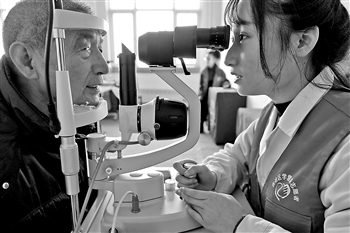 12月4日,唐山市古冶区医疗志愿者为社区居民检查眼睛。