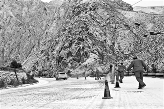 11月29日,甘肃省张掖市出现降雪降温天气,部分公路路面存在积雪,给公众出行带来不便。甘肃省张掖公路局启动应急预案,组织人员和机械设备开展除雪保畅作业,在重点路段、急弯陡坡处撒布防滑料和融雪剂,全力保障公路安全畅通。