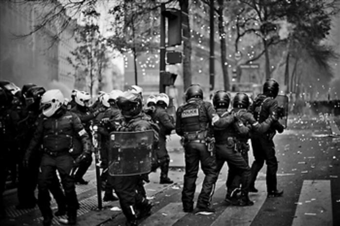 12月5日,在法国巴黎,警察与游行示威者对峙。