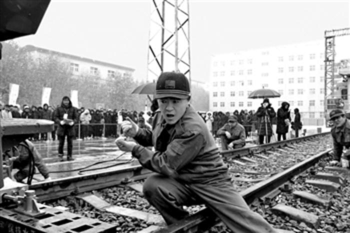 保障组的员工在比赛现场冒着小雪,以制造轨道车脱轨事故的方式,给参赛选手设置轨道车应急起复演练障碍的难题,旨在锻炼参赛选手在复杂环境条件下快速安全将脱轨轨道车复位的能力。