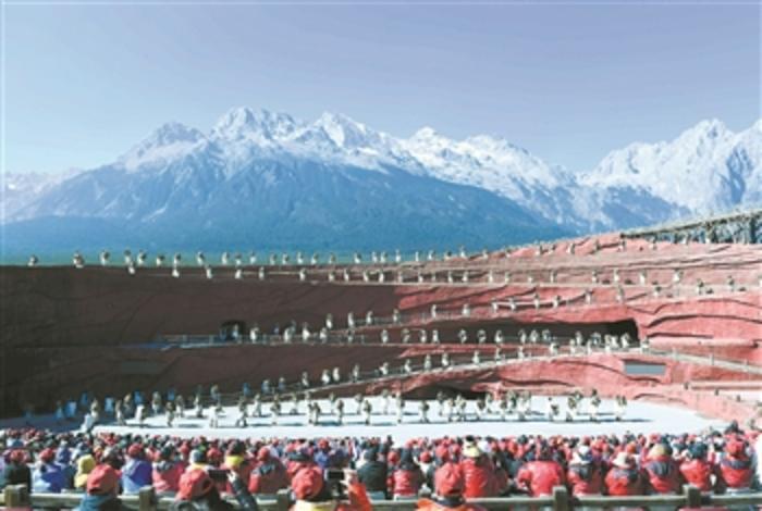 12月10日,游客在玉龙雪山下观看大型实景演出。冬季,云南省丽江玉龙雪山景色秀美壮观,吸引了众多游客。 新华社记者 杨宗友 摄