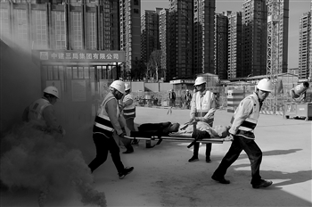 建筑工地演练“救伤员”