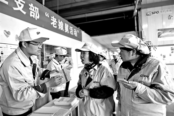 为解决职工实际困难,该公司机关二支部聘请公司领导、车间负责人、党员等为“老娘舅”,走进生产车间提供信息咨询服务,面对面收集员工的需求信息,解答和解决岗位安排、春节返乡等问题。 包康轩 摄/中新社