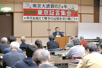为悼念南京大屠杀死难者并揭露侵华日军残忍罪行,由日本南京东京证言集会执行委员会主办的“南京大屠杀82年 2019东京证言集会”11日晚在东京举行。集会呼吁日中两国人民不忘历史,共创和平友好未来。 新华社记者 杜潇逸 摄