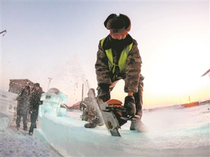 12月15日,工人在第二十一届哈尔滨冰雪大世界园区施工。本届冰雪大世界占地面积60万平方米,将用20多万立方米的冰雪打造出一座“冰雪梦工厂”。