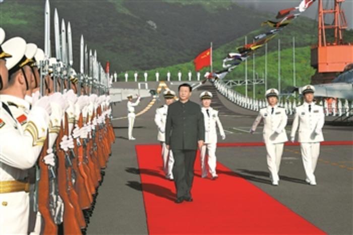 随后,习近平登上山东舰,检阅仪仗队。习近平察看有关装备,了解舰载机飞行员工作生活情况。习近平前往驾驶室,同官兵亲切交流,在航泊日志上郑重签名。