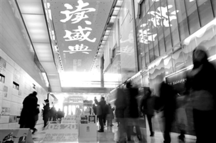 12月17日,北京天桥艺术中心,设有垂幅、天幕、书架的“书香长廊”吸引观众们驻足观看。