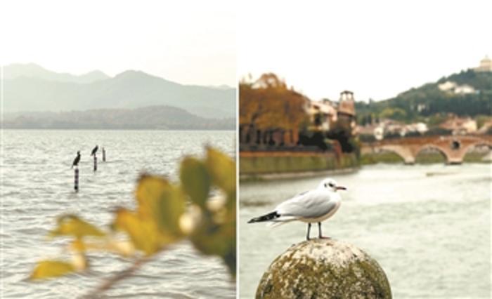 右图为11月12日,在意大利维罗纳,一只水鸟站在阿迪杰河畔。(新华社记者程婷婷摄)