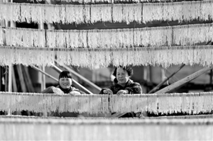 12月10日,在浙江省杭州市临安区天目山镇长六村,村民正在晾晒番薯面。