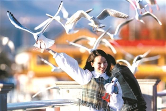 近日,“春城”昆明阳光明媚,气候宜人,市民游客纷纷来到海埂大坝、翠湖公园等地,与前来越冬的红嘴鸥近距离接触,人鸥同乐。红嘴鸥是云南昆明的“荣誉市民”,每年秋冬季都会来到昆明越冬。