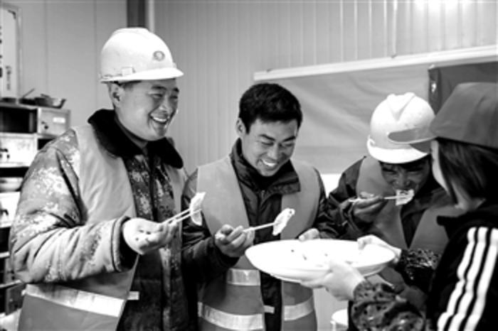 12月21日,农民工在安九铁路安徽段项目工地上品尝刚出锅的饺子。