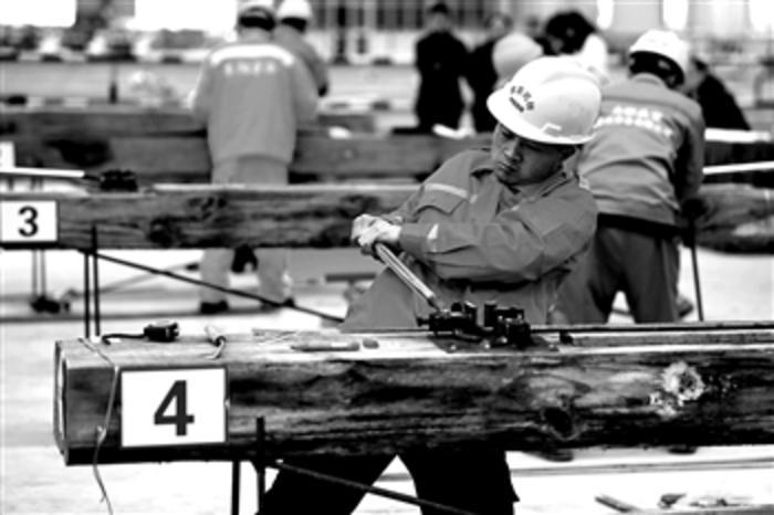 12月23日,参赛工人在钢筋工项目中比拼。当日,安徽省重点工程建筑行业首届农民工技能竞赛在合肥举行。来自全省建筑行业的电焊工、钢筋工在各自项目上各展绝活、比拼技能。