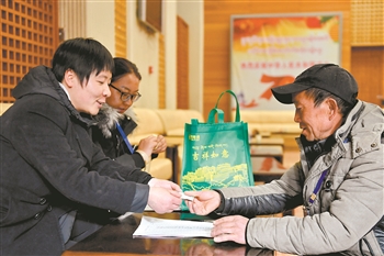 12月23日,在拉萨火车站,一名受助务工人员(右)从中国邮政集团公司西藏自治区分公司工作人员手中接过火车票。
