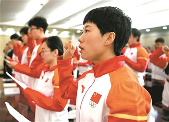12月25日,中国体育代表团教练员张会(前)在成立动员大会上宣誓。