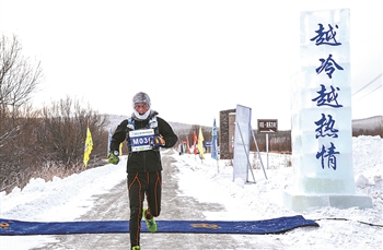 12月25日,一名参赛选手冲过终点。当日,2019中国冷极马拉松在内蒙古自治区根河市开跑。本次赛事设男、女半程马拉松和男、女健康跑。根河市被称为“中国冷极”,最低气温达到过零下58摄氏度。 新华社记者 徐钦 摄