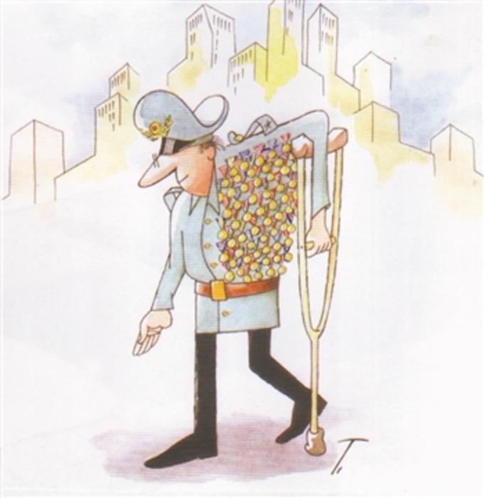 画中人是“为名所累”的典型。本来获取诸多荣誉更应“眼望捷旌旗 ,奋力争朝夕”,但此公被奖章压得不堪重负,将自己弄成残疾。