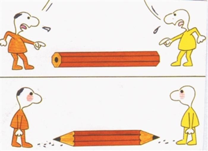 眼前一枝铅笔,两人各执己见,争长论短说黑道白。最终削开两端露出笔芯,早知如此何必当初……