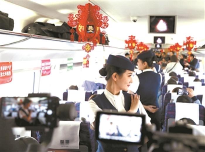 12月29日,乘务人员在由银川站开往中卫南站的C8201次列车上为乘客表演节目。