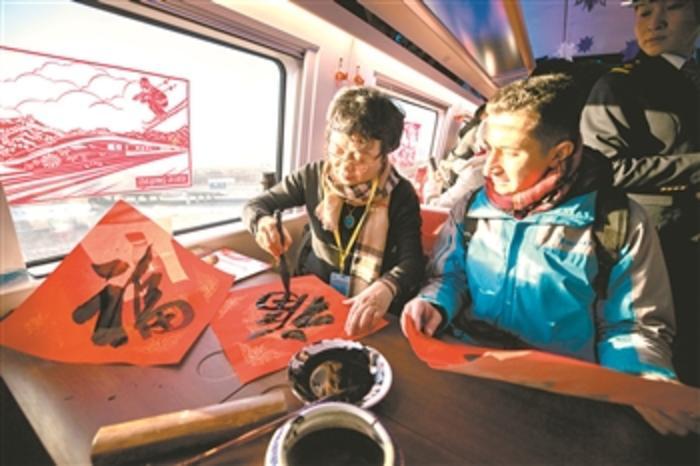12月30日,铁路老职工杨春燕在北京北站驶往太子城的高铁上为一名波兰旅客写福字。本报记者 王伟伟 摄
