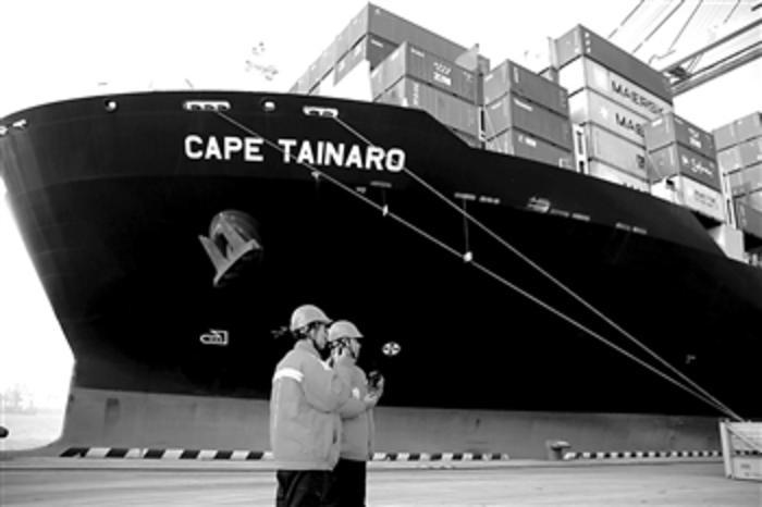 12月28日,两名青岛港工人在巡视生产安全情况。