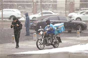 2019年12月,北京街头,风雪中外卖小哥。(本报资料图片)