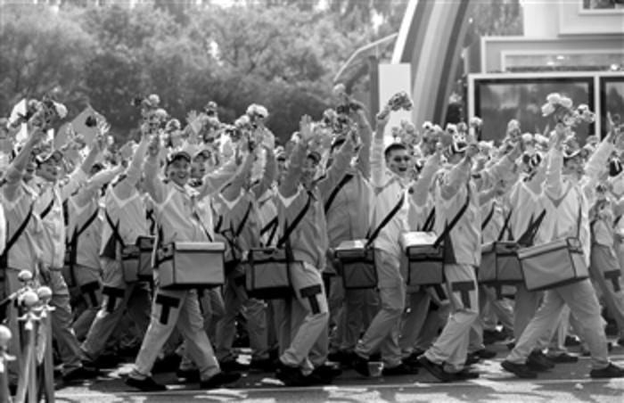 2019年10月1日,在庆祝新中国成立70周年大会的群众游行方阵中,出现了代表新时代新职业的外卖小哥,他们作为“美好生活”方阵的一部分,挥着彩旗走过天安门广场。这是外卖骑手首次参加国庆阅兵群众游行活动。