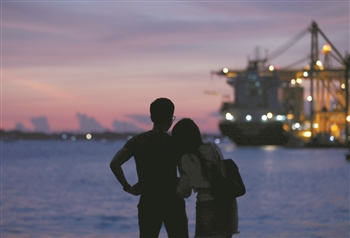9月16日,在缅甸仰光,一对情侣在海港欣赏落日美景。新华社发(吴昂摄)