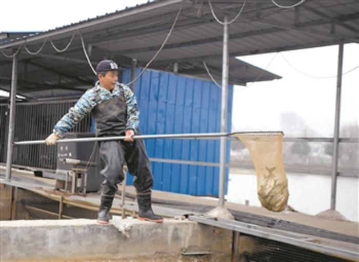 图为湖南邵东市九贝生态养殖场工作人员盛国平在“跑道”鱼塘边捞鱼。新华社记者 薛宇舸 摄