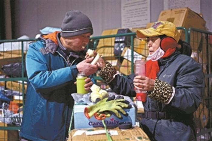 1月1日下午,江苏省徐州市沛县邮政分公司寄递事业部,周洪伟、周红梅夫妻俩已连续工作了三个班次,18时06分,他们回班简单充饥后将再次出发投递快包。他们从事投递工作已经近三十年。