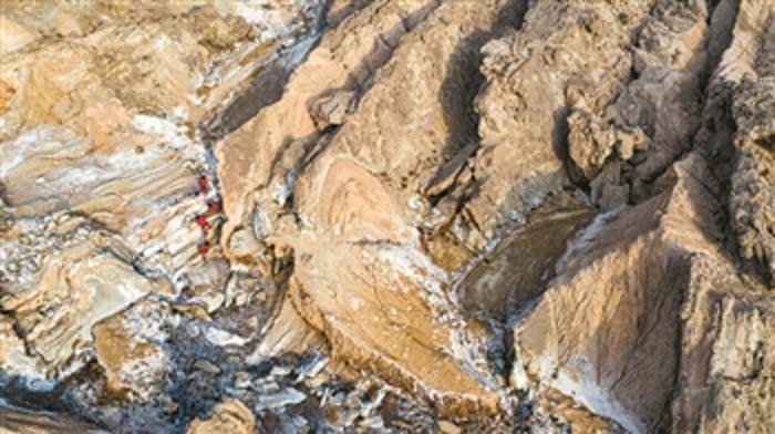 1月1日,新疆秋里塔格刀片山脚下,中国石油塔里木油田油气运销部员工在对西气东输管道进行徒步巡线。吕殿杰 摄